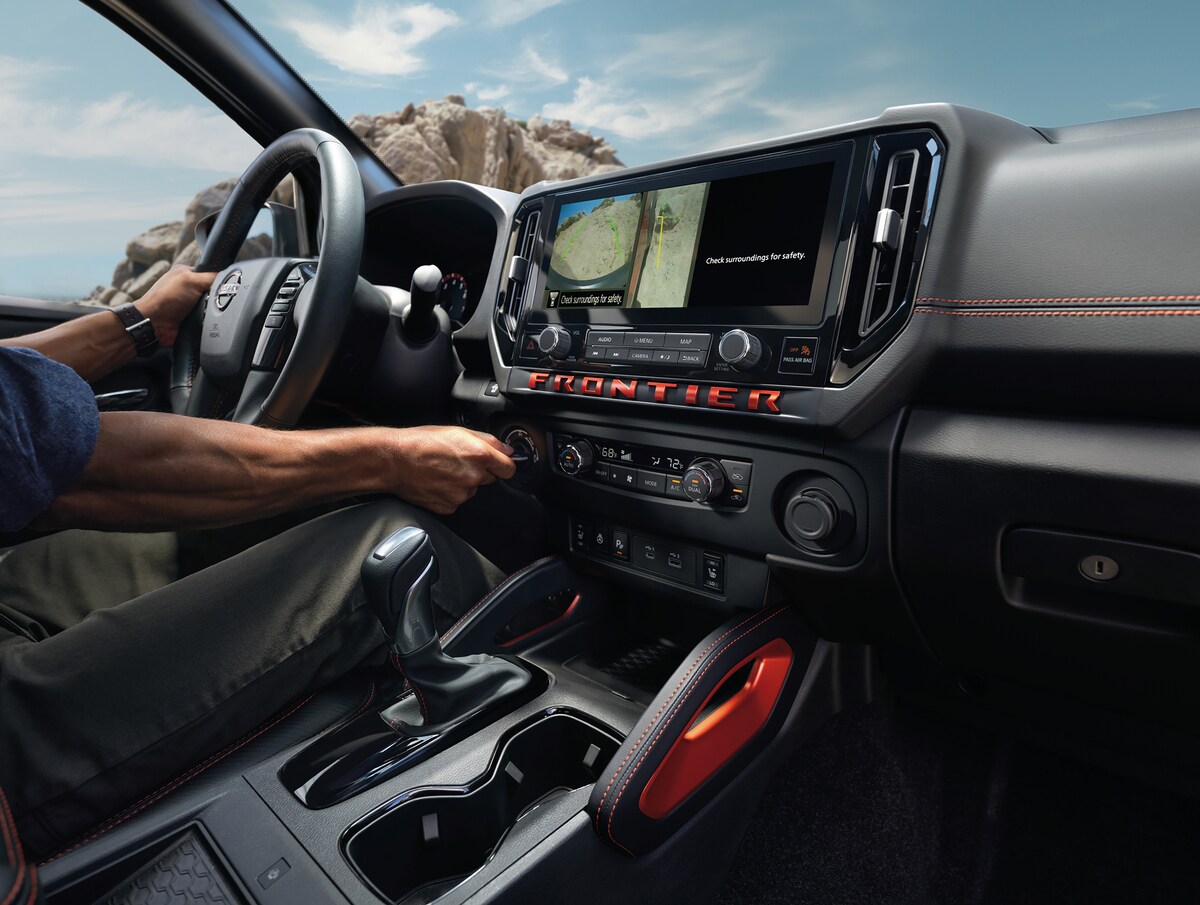 The base Frontier S trim comes standard with an eight-inch color touchscreen display with wired Apple CarPlay® and Android Auto™ compatibility, while SV and higher trims upgrade to a larger 12.3-inch touchscreen with wireless smartphone integration. Every Frontier includes a Bluetooth hands-free phone system and audio streaming, voice recognition, and NissanConnect services with Wi-Fi hotspot capability.