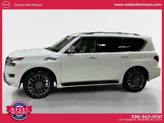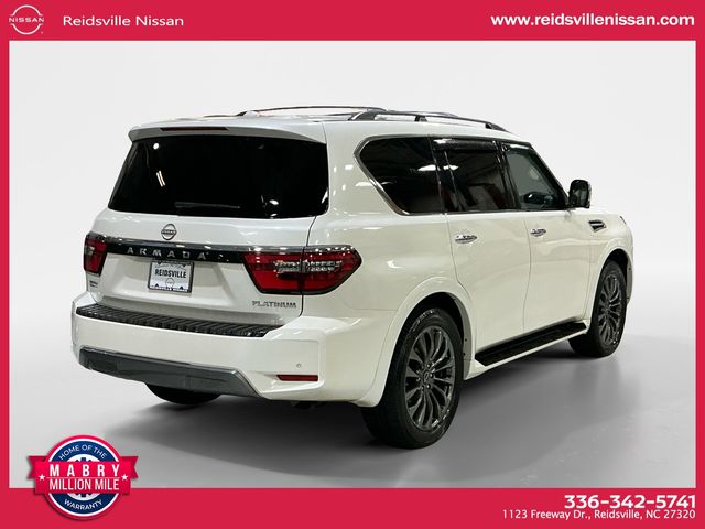 Your Next Ride Starts Here at Reidsville Nissan!'Clean CARFAX. Aspen White Tricoat 2023 Nissan Armada Platinum 4WD 7-Speed Automatic 5.6L V8 DOHC 32V LEV3-ULEV125 400hp Local Trade, Fully Detailed, MILLION MILE WARRANTY, 4WD, Auto High-beam Headlights, Cargo Package, NissanConnect featuring Apple CarPlay and Android Auto, Power moonroof, Rear-Seat Entertainment.